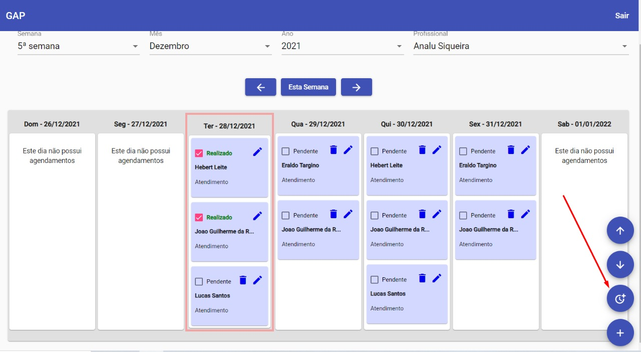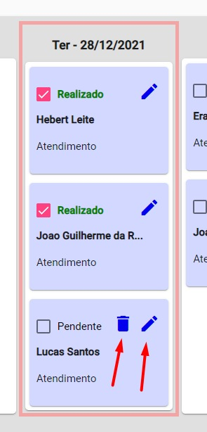 Clique no ícone para excluir o agendamento ou no ícone para alterar a data do agendamento ou qualquer outra informação. Clicando no botão é possível cadastrar ou excluir seus agendamentos.