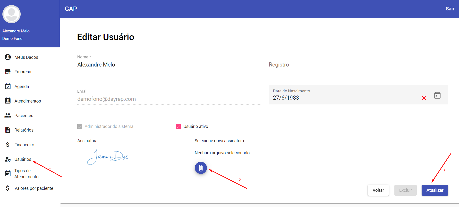 Cadastre a assinatura dos profissionais para que apareçam no relatório de evoluções. Para isso acesse o menu "Usuários", selecione um usuário, faça o upload da imagem da assinatura e clique no botão Atualizar.