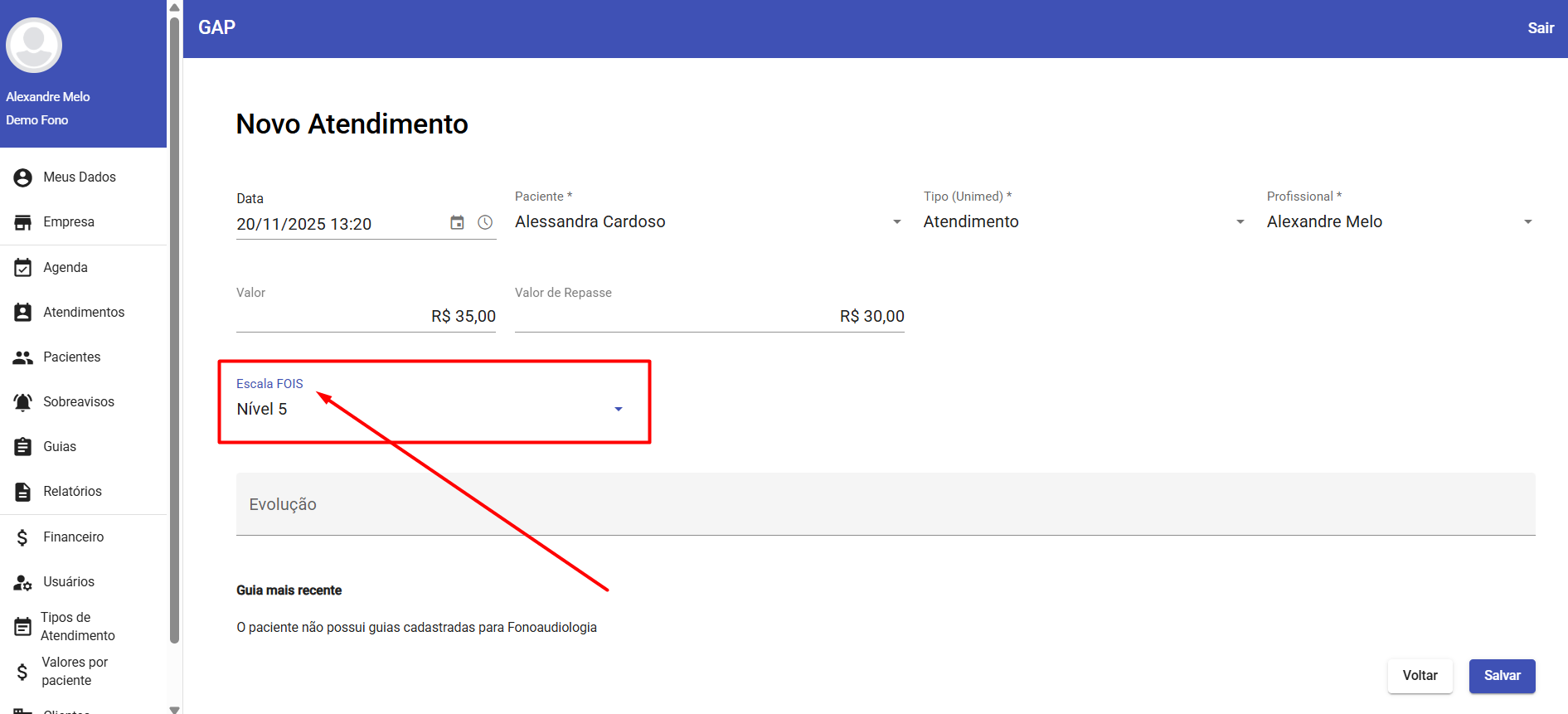O relatório de indicadores de escala fois está disponível para as empresas com atendimento fonoaudiológico. Antes de gerar o relatório é necessário cadastrar a escala fois para pelo menos um atendimento fonoaudiológico realizado, para cada paciente. A escala fois do atendimento pode ser cadastrada na tela de edição do atendimento, acessível através do menu "Atendimentos" ou "Agenda".