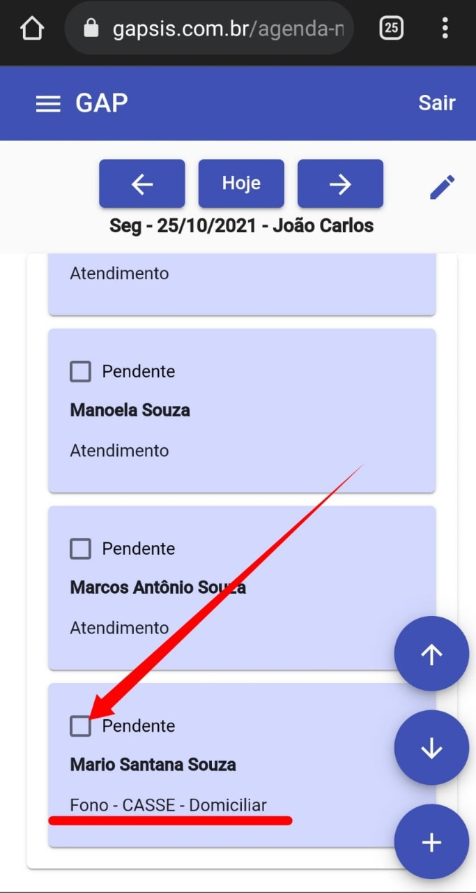 Cadastre seus atendimentos acessando o menu "Agenda" ou "Atendimentos". Na agenda, confirme o atendimento clicando na caixa de seleção “Pendente”. Verifique se o tipo de atendimento, logo abaixo, está correto.