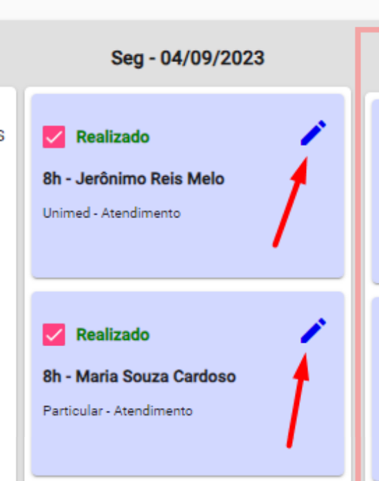 Caso tenha confirmado a realização de um agendamento, após a confirmação clique no ícone para editar o atendimento e cadastrar a evolução.