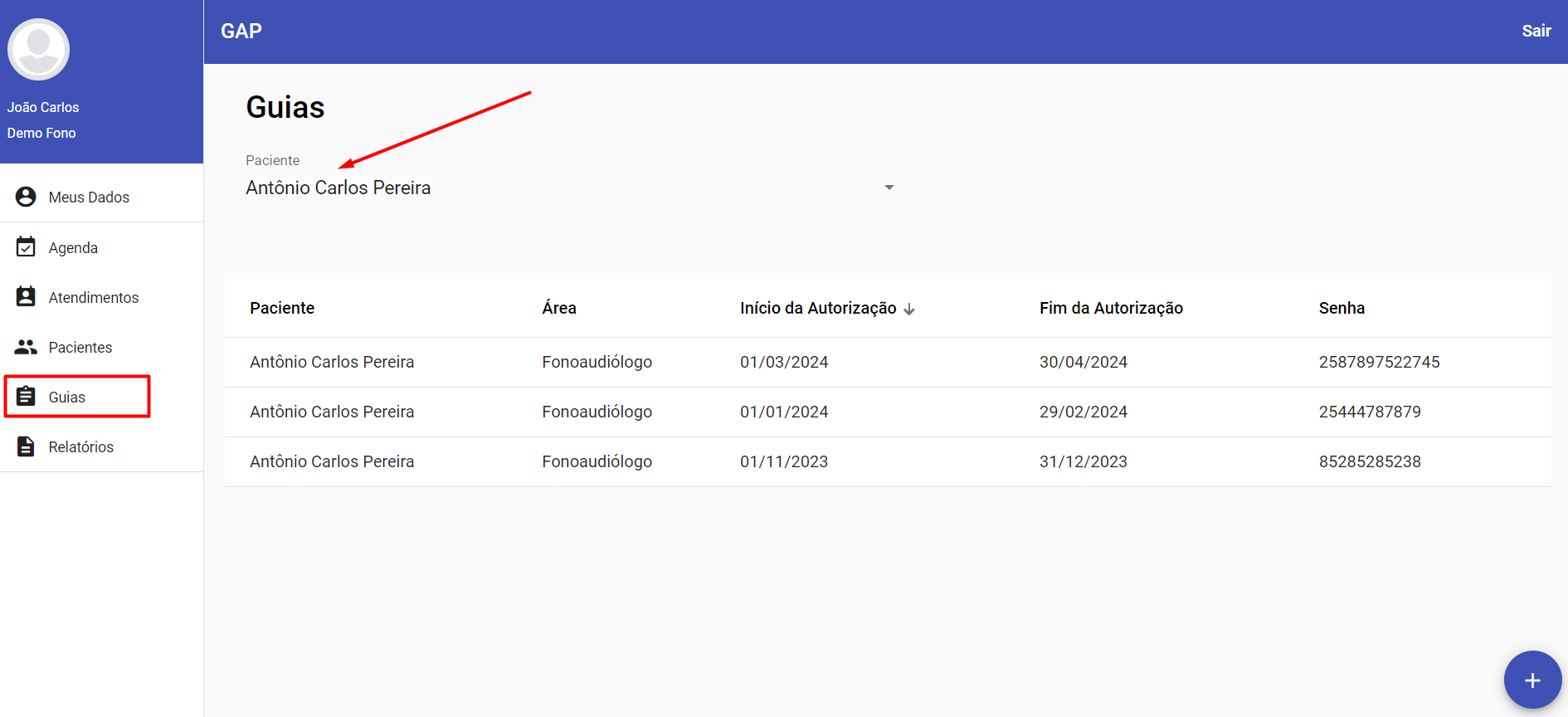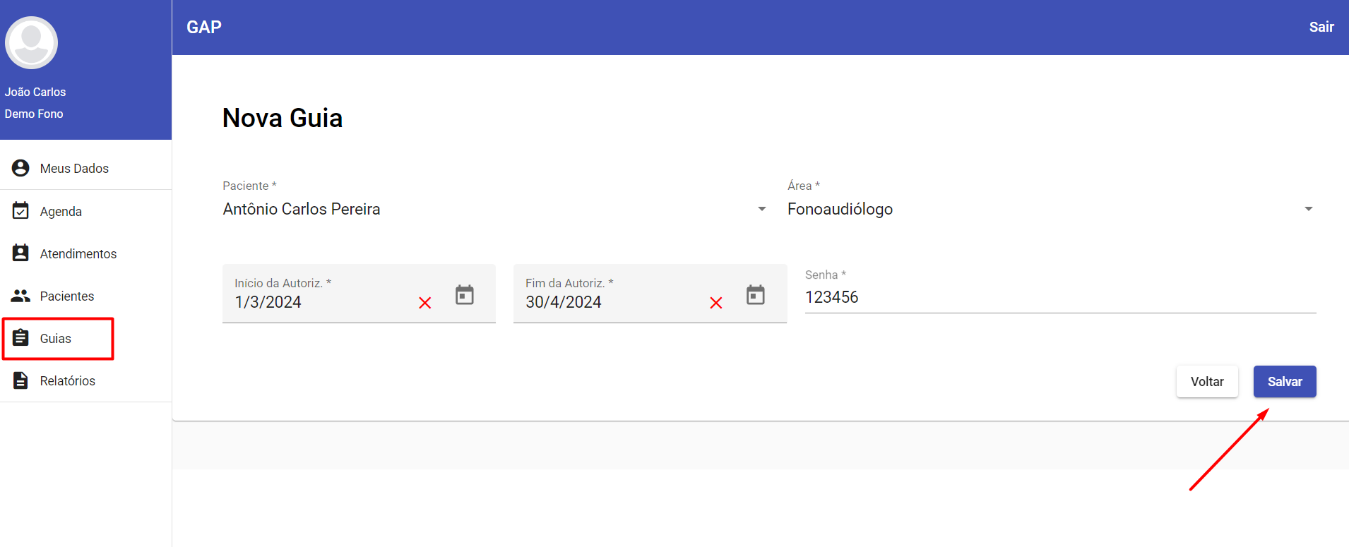 Cadastre as senhas das guias dos pacientes acessando o menu "Guias". Para cadastrar uma nova guia clique no botão , em seguida informe o paciente, sua área de atuação, a data de início e fim da autorização, a senha e clique no botão Salvar.