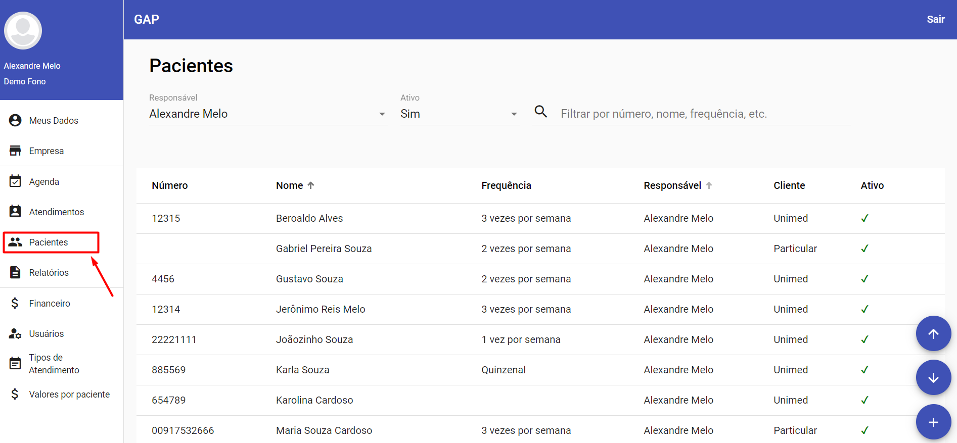 Para gerenciar seus pacientes acesse o menu “Pacientes”. Ao selecionar este menu os seus pacientes serão listados.