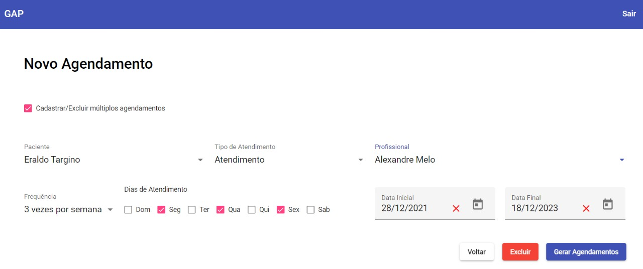 Ao seleciona a caixa "Cadastrar/Excluir múltiplos agendamentos" você poderá selecionar o paciente, o tipo de atendimento, os dias de atendimento, informar a data inicial e final para os agendamentos e gerar todos de uma só vez. Caso clique no botão "Excluir" você poderá excluir todos os agendamentos de um paciente com apenas um clique.