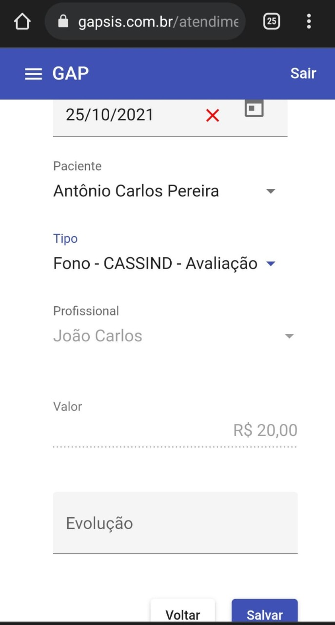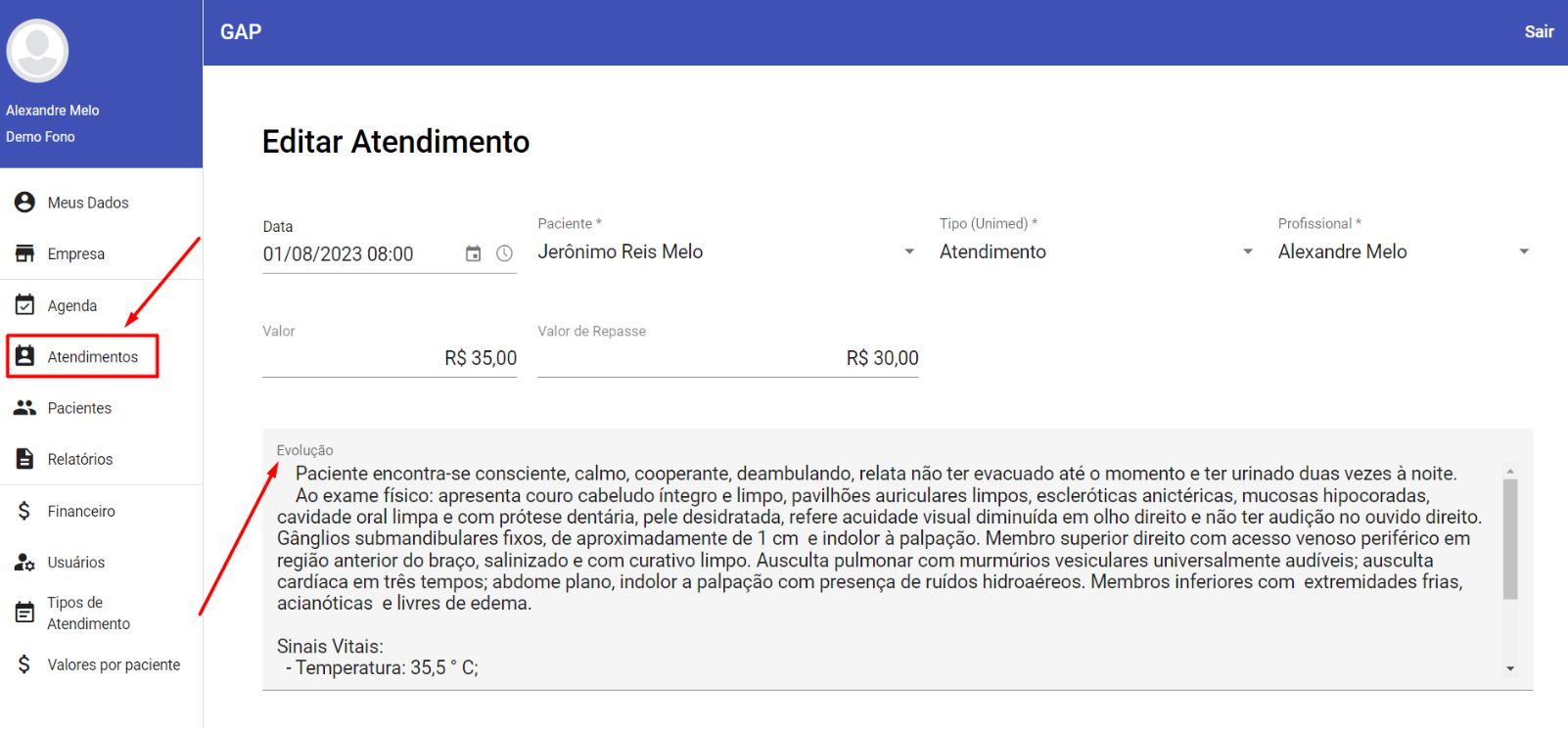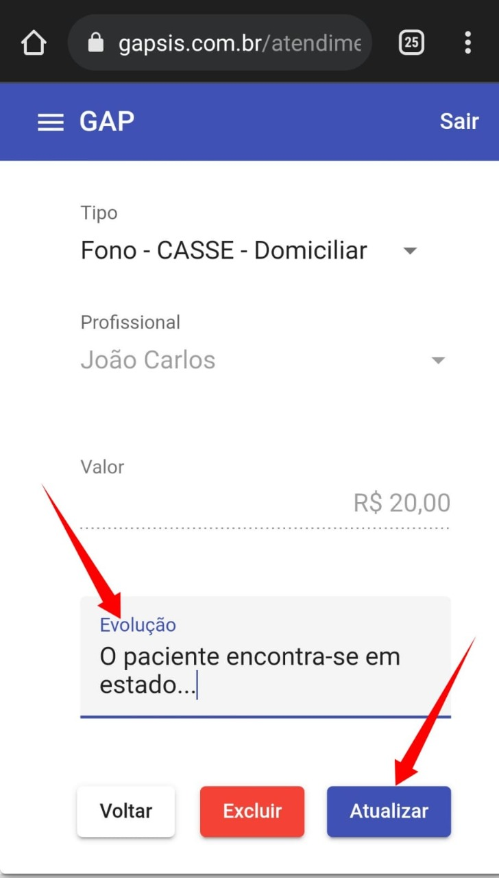 Após a confirmação do atendimento clique no lápis para preencher a evolução. Preencha a evolução e clique no botão atualizar.