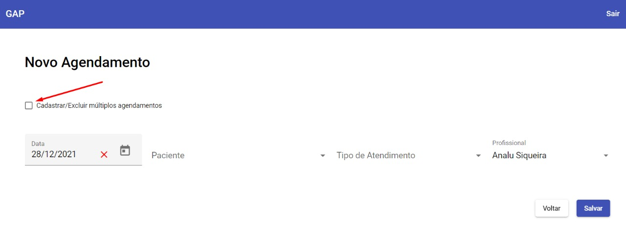 Ao seleciona a caixa "Cadastrar/Excluir múltiplos agendamentos" você poderá selecionar o paciente, o tipo de atendimento, os dias de atendimento, informar a data inicial e final para os agendamentos e gerar todos de uma só vez. Caso clique no botão "Excluir" você poderá excluir todos os agendamentos de um paciente com apenas um clique.