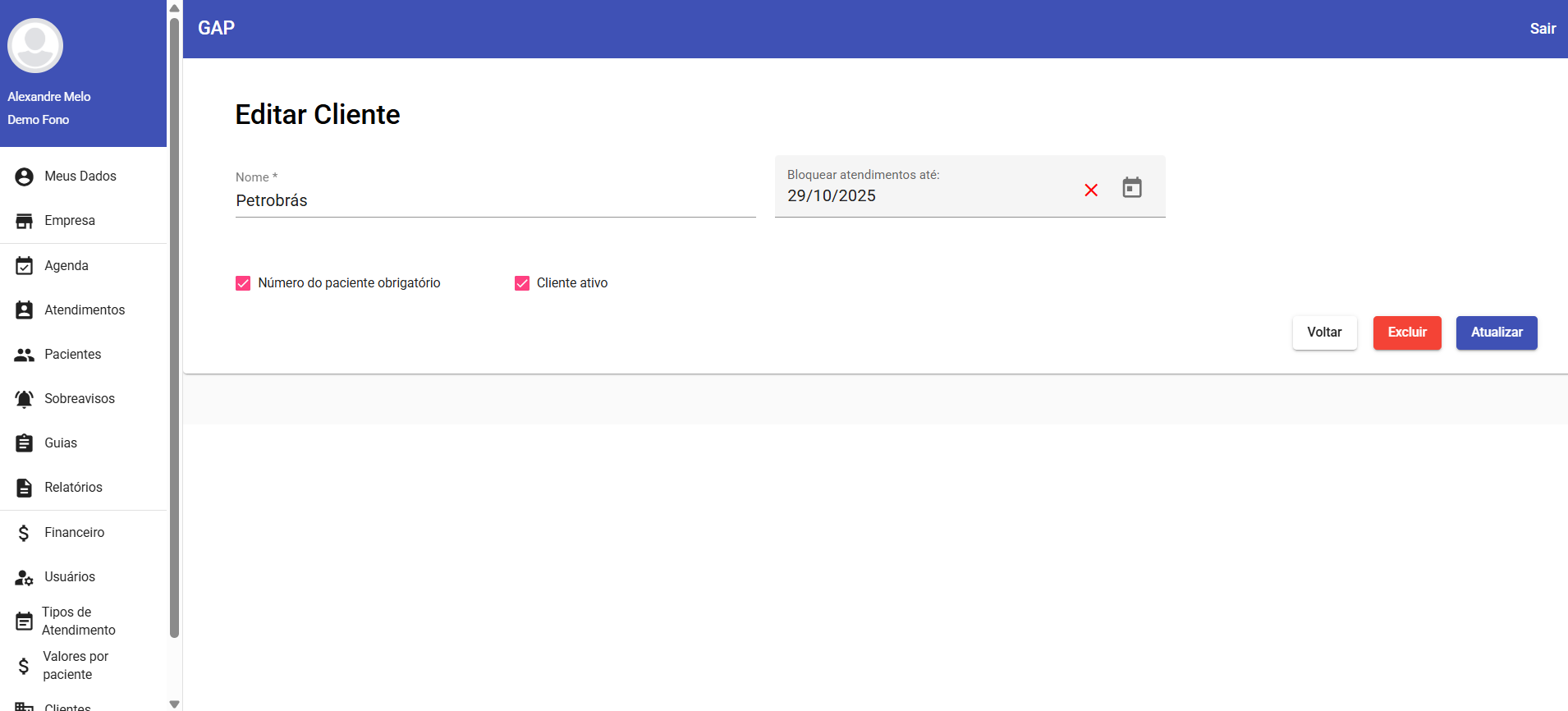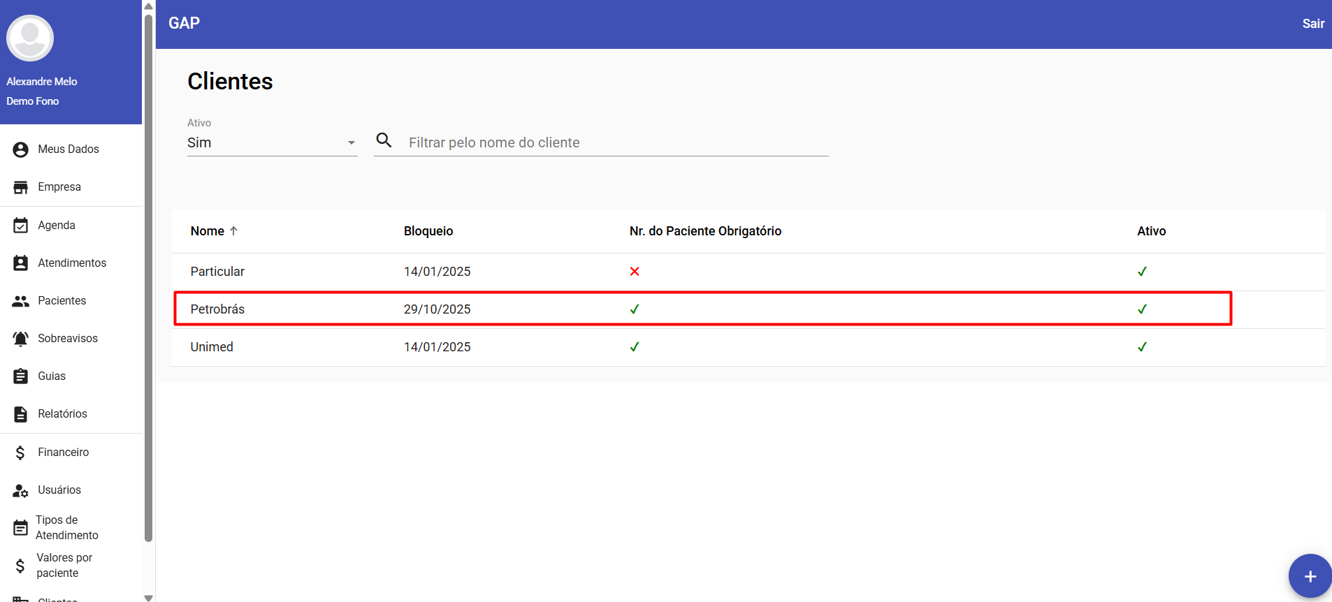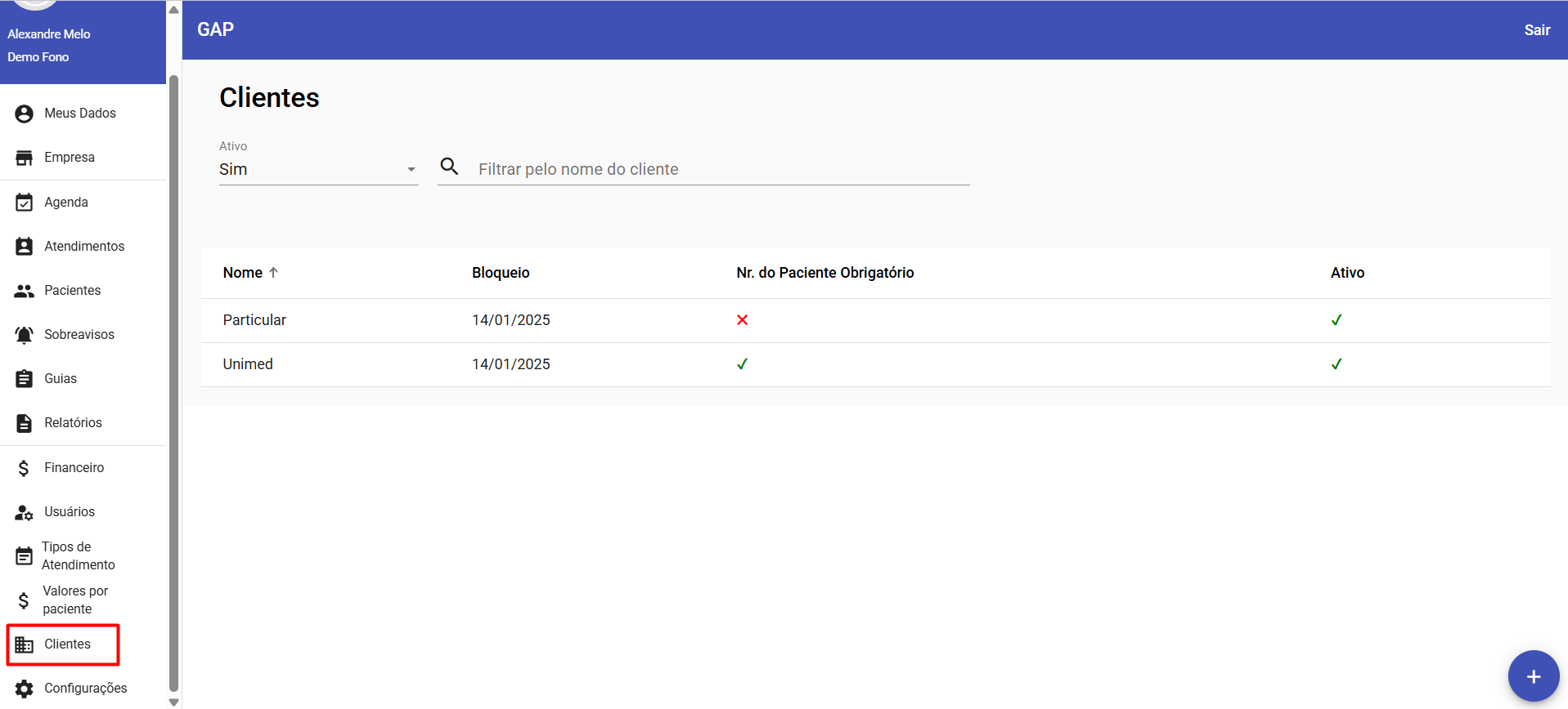 Quando um cliente não for mais ser utilizado desmarque o campo para que o cliente não fique mais disponível para seleção na tela de cadastro de pacientes.