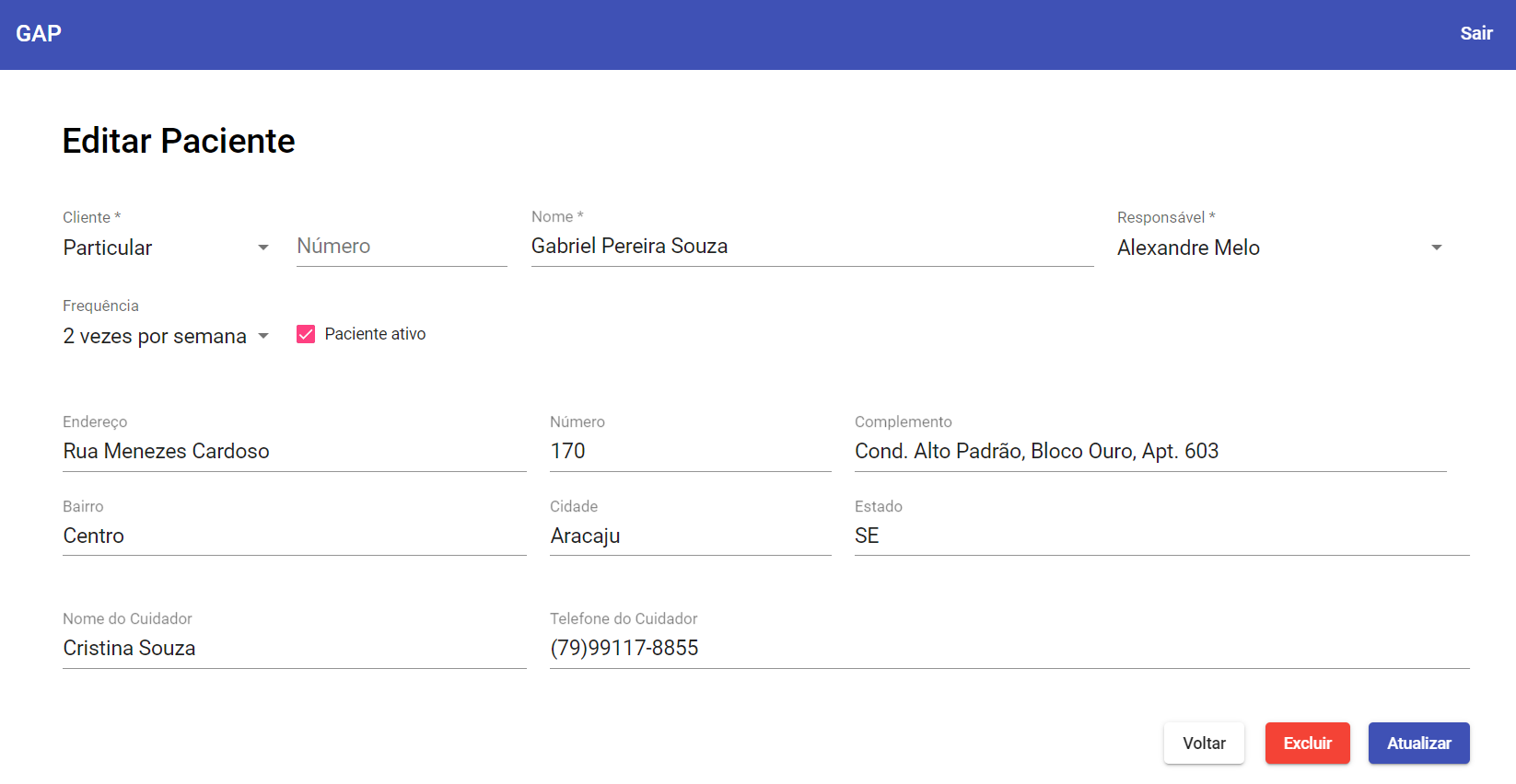 E na tela de edição do paciente utilize o botão para excluir o paciente e o botão para atualizar os dados do paciente.
