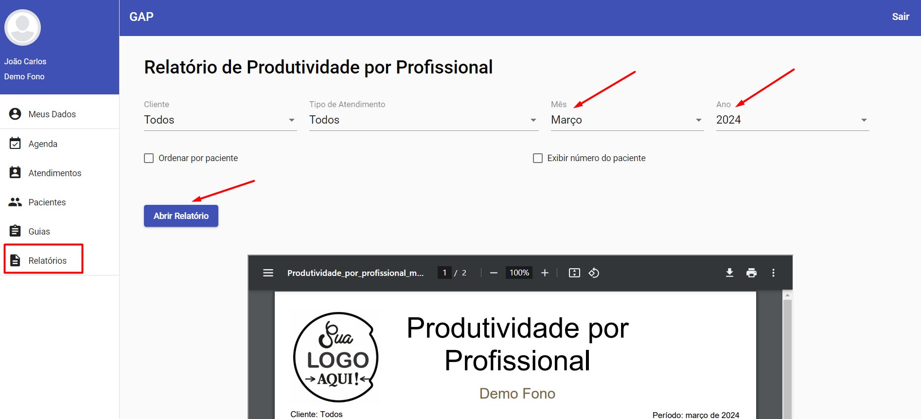 Uma vez que a guia esteja cadastrada os seus dados serão exibidos no relatório de produtividade por profissional.
