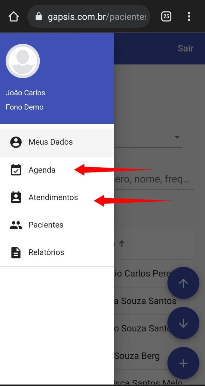 Para gerenciar seus pacientes acesse o menu “Pacientes”. Ao selecionar este menu os seus pacientes serão listados.
