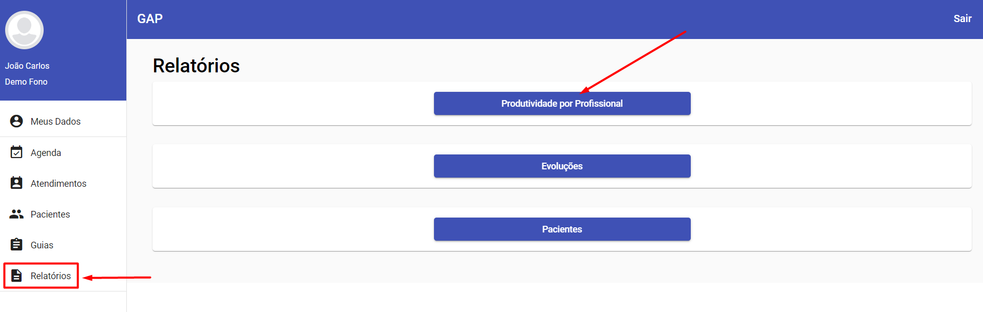 Para verificar seus valores a receber decorrentes dos seus atendimentos realizados acesse o menu "Relatórios" e depois clique no botão "Produtividade por Profissional"