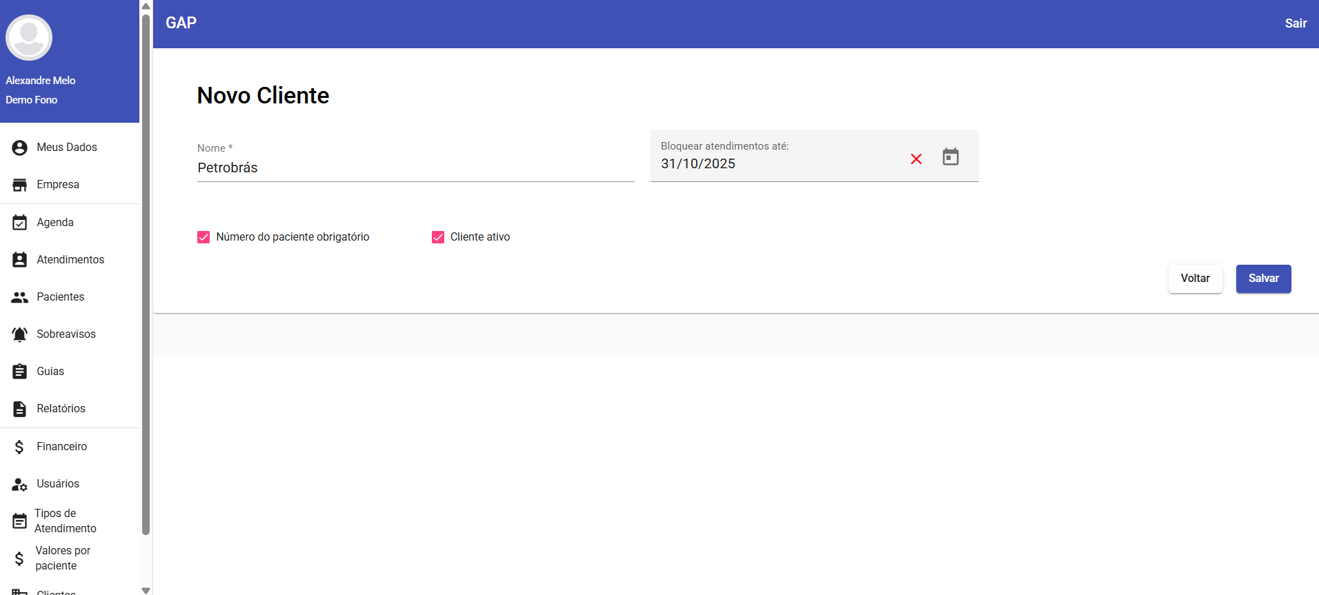 Clique no botão para cadastrar um novo cliente. Em seguida informe o nome do cliente e marque a caixa de seleção "Número do paciente obrigatório" caso queira que o campo número seja obrigatório no cadastro dos pacientes desse novo cliente. No campo "Bloquear atendimentos até:" informe uma data de bloqueio para impedir que os usuários (não administradores) cadastrem atendimentos com data anterior ou igual a esta data de bloqueio. Por fim clique no botão Salvar.