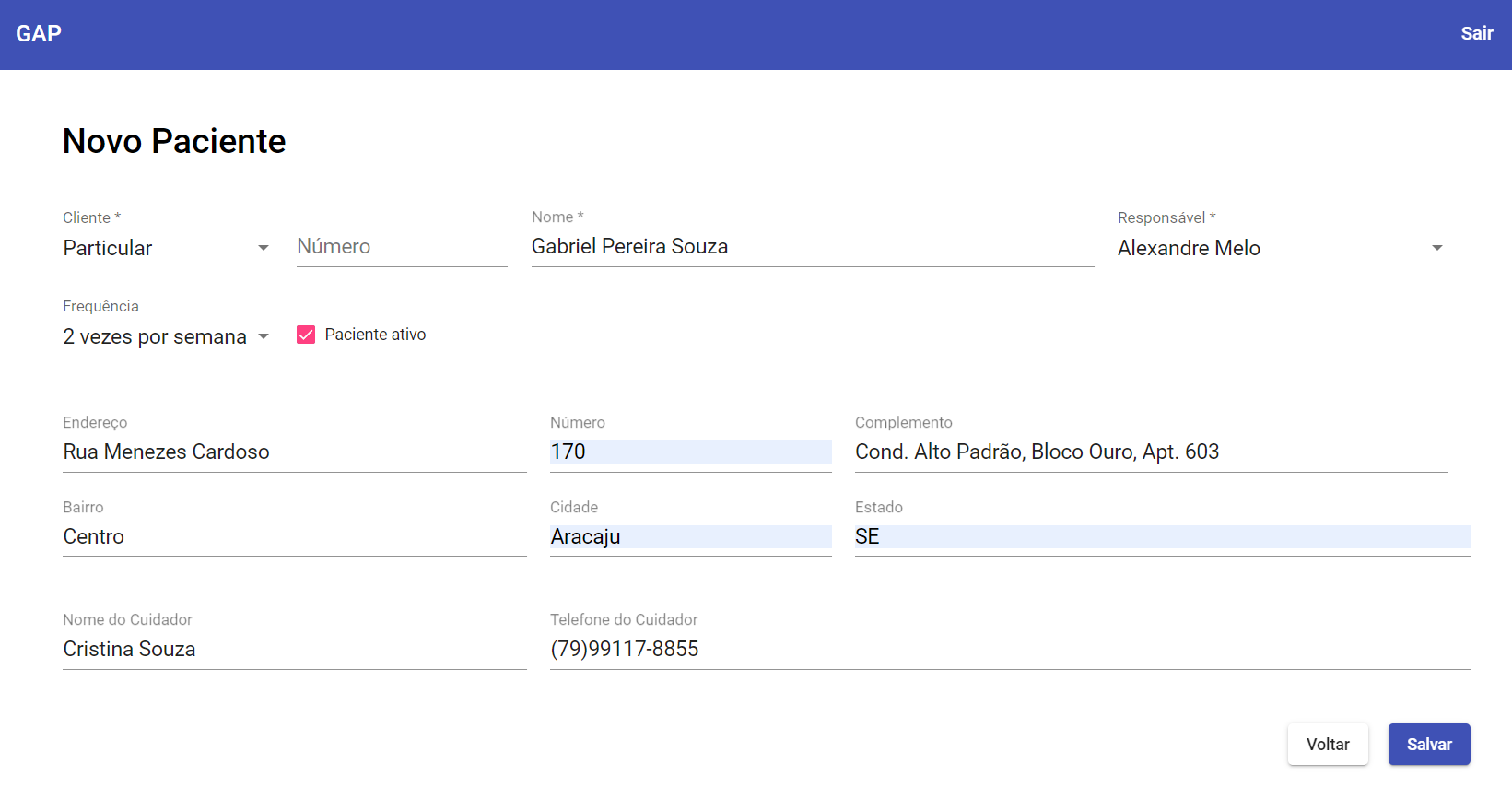 Clique no botão para cadastrar um novo paciente. Em seguida informe o número do paciente caso necessário, informe o nome do paciente e a frequência dos atendimentos. O preenchimento do endereço e dados do cuidador é opcional. Por fim clique no botão Salvar.