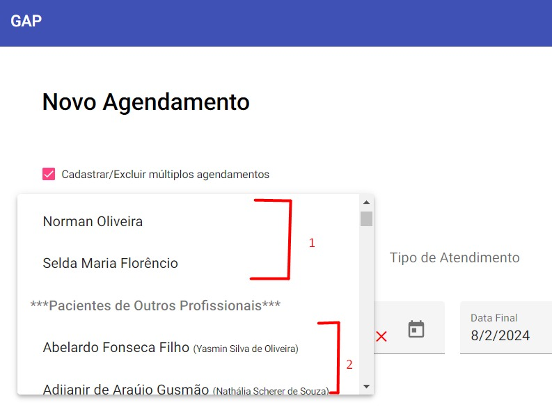 Os profissionais que atendem um mesmo paciente não devem duplicar o cadastro do paciente no GAP. Com apenas um cadastro do paciente todos os profissionais conseguem cadastrar seus atendimentos e agendamentos. Nesse caso de compartilhamento de paciente o único detalhe é que apenas um dos profissionais poderá ser o responsável, portanto ao selecionar um paciente, caso você seja o responsável do paciente ele estará listado nesse primeiro bloco, caso contrário o paciente estará listado no bloco "Pacientes de Outros Profissionais"