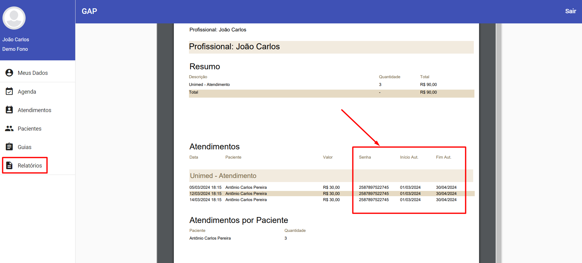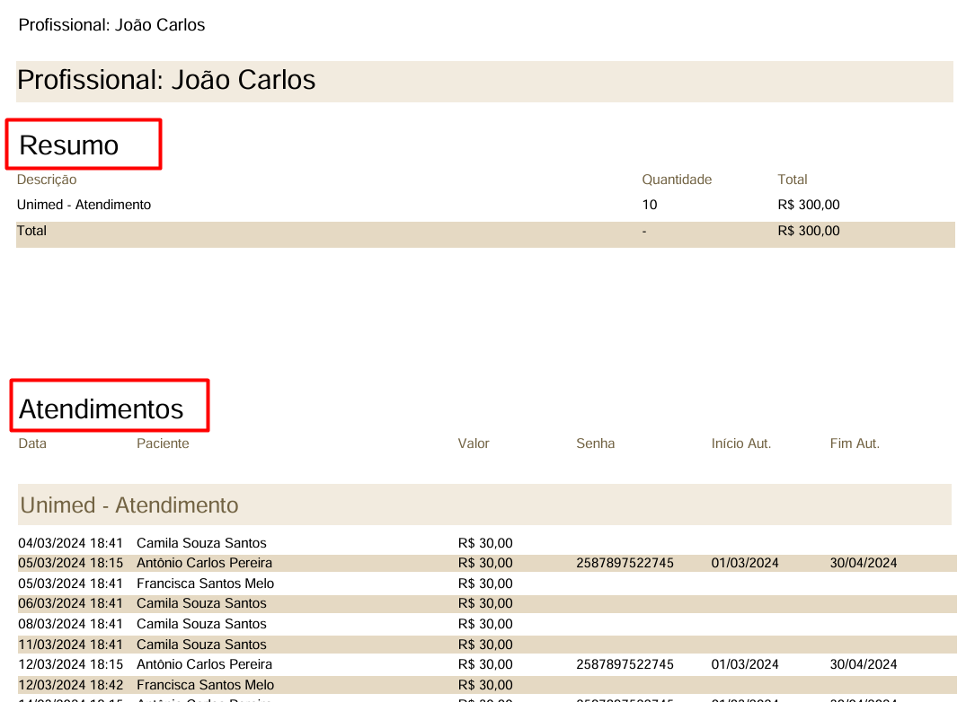 Na sessão "Resumo" do relatório verifique o total a receber no período. Na sessão "Atendimentos" terá um descritivo de todos os atendimentos registrados e seus valores individuais.