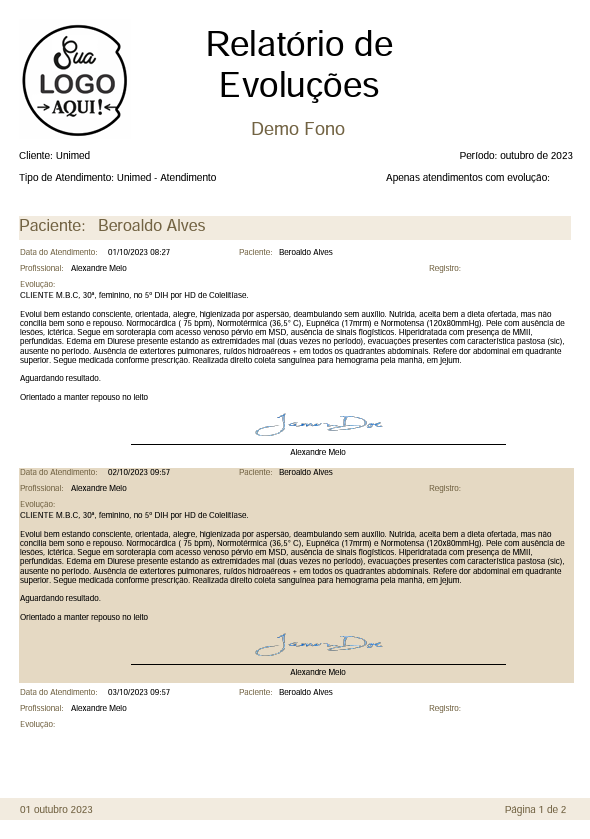 Cadastre a assinatura dos profissionais para que apareçam no relatório de evoluções. Para isso acesse o menu "Usuários", selecione um usuário, faça o upload da imagem da assinatura e clique no botão Atualizar.