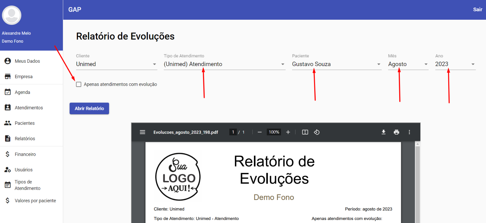 Para gerar o relatório de evoluções selecione o mês, ano, o paciente e o tipo de atendimento do paciente. Marque a caixa de seleção “Apenas atendimentos com evolução” para remover do relatório os atendimentos que não possuem evolução.