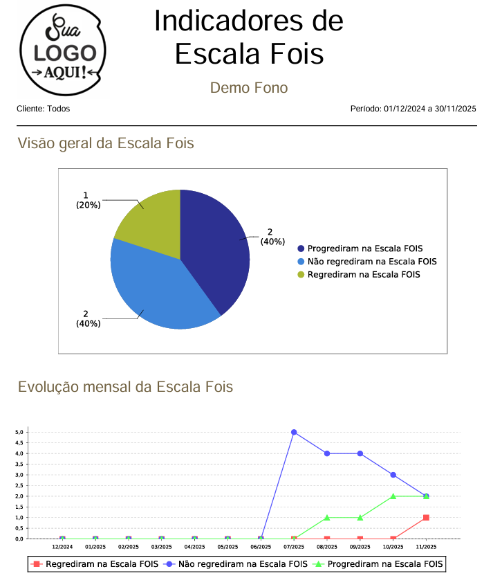 O relatório de indicadores de escala fois está disponível para as empresas com atendimento fonoaudiológico. Antes de gerar o relatório é necessário cadastrar a escala fois para pelo menos um atendimento fonoaudiológico realizado, para cada paciente. A escala fois do atendimento pode ser cadastrada na tela de edição do atendimento, acessível através do menu "Atendimentos" ou "Agenda".
